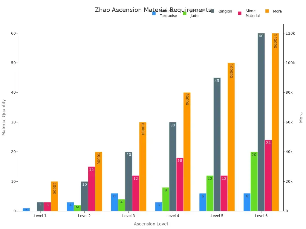 You need many materials to fully ascend Zhao. Planning ahead saves time and energy. Here is a table to help you see what you need for each ascension level: