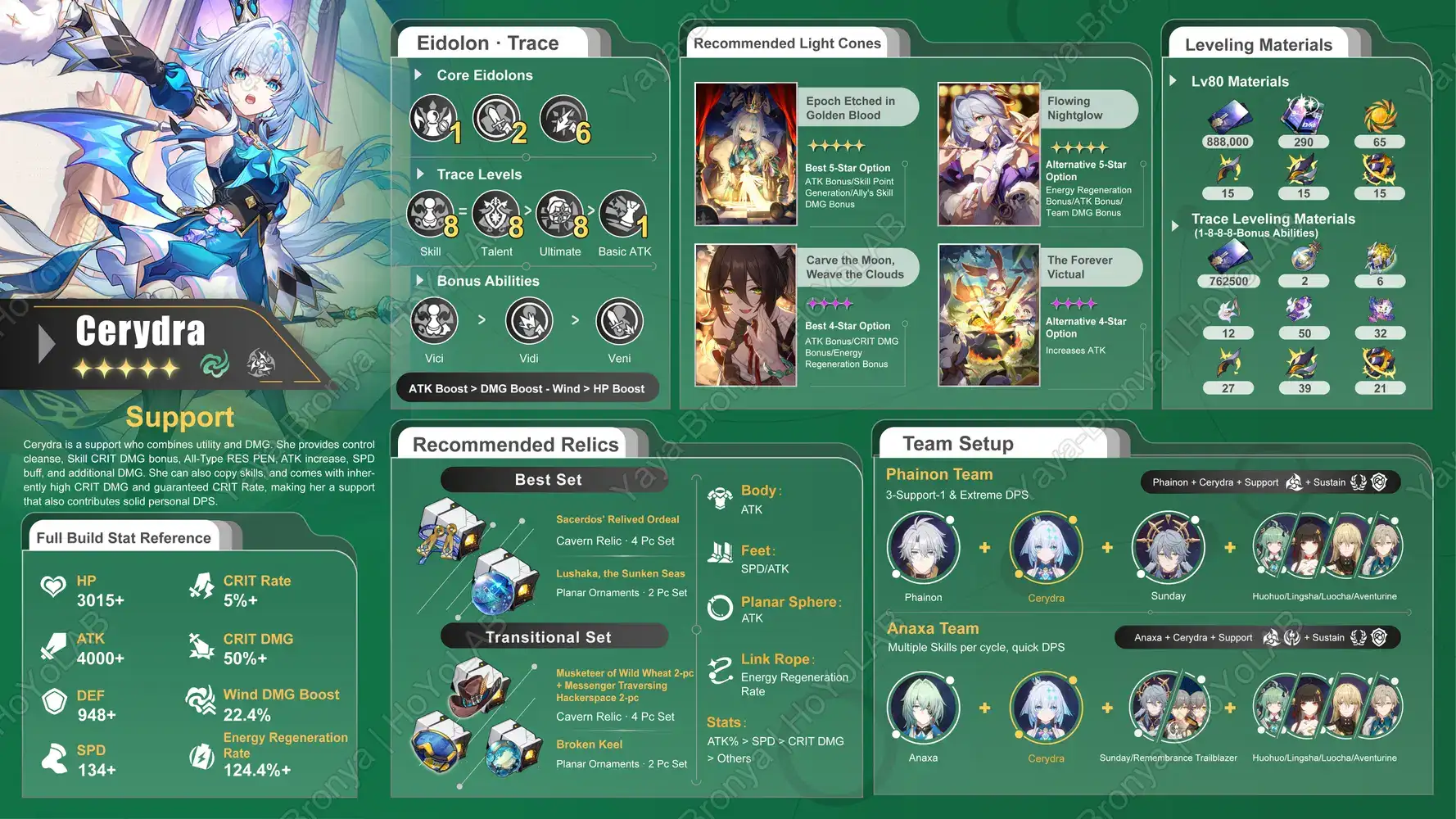 You want your supports to help Cerydra and your DPS do more damage. Focus on relics and stats that boost speed, attack, and skill point generation. Hanya works best at C6, but you can use other F2P supports if needed. Gallagher gives healing and keeps your team alive.