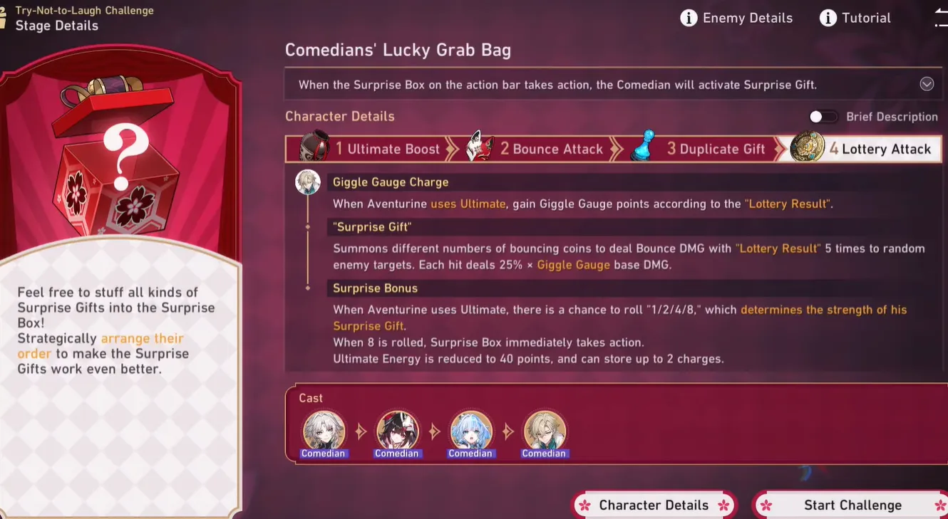 You start the Try-Not-to-Laugh Challenge with easier battles. Focus on learning enemy patterns and testing your team’s skills. Use trial characters to see which combos work best. Try to save your strongest skills for the last wave of each stage. If you see a tough enemy, use your support’s buffs and shields early. Keep your team healthy by rotating healers and using basic attacks to charge energy.